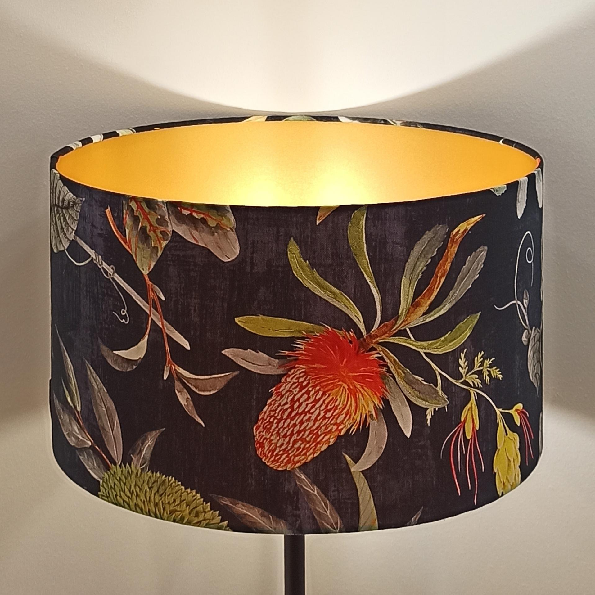 Η Abajur Gold-Line Lampshade Collection. Τα αμπαζούρ με χρυσή επένδυση προσφέρουν μια εκλεκτική σειρά από αποχρώσεις φωτιστικών κατά παραγγελία που διατίθενται σε πολυτελή μετάξι, λεία βαμβακερά και ζεστά βελούδα, όλα συνδυάζονται όμορφα με την ατμοσφαιρική εσωτερική επιφάνεια επιβραδυντικού φλόγας PVC σε χρυσό σαγρέ, η οποία επιτρέπει στο χρώμα στο εξωτερικό του αμπαζούρ να παραμένει πλούσιο και αδιαφανές.