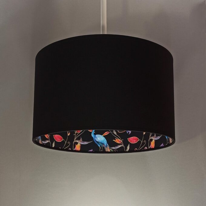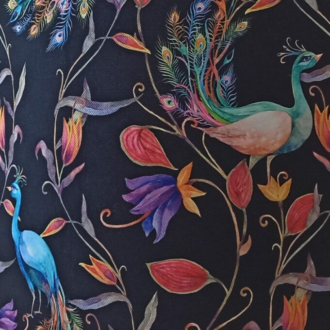 Κυλινδρικό σκληρής επιφάνειας PVC με ύφασμα PANAMA DIGITAL PRINT – PEACOCKS BLACK εσωτερικά και μαύρο DUCHESS MAT SATIN εξωτερικά.